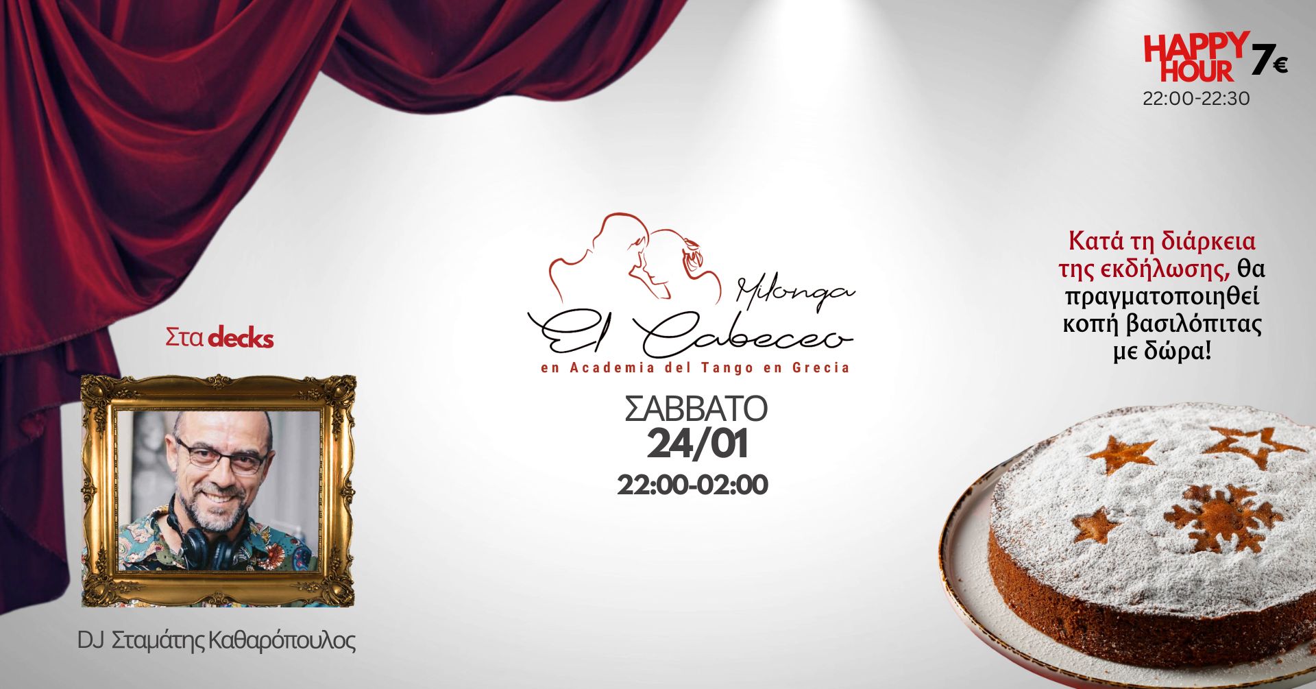 💃 Σάββατο 24/1 | 22:00–02:00Milonga “El Cabeceo” με DJ Σταμάτη Καθαρόπουλο 🎧Κατά τη διάρκεια της βραδιάς θα γίνει κοπή βασιλόπιτας με δώρα 🎁Μια Milonga με χορό, χαμόγελα και λίγη τύχη
