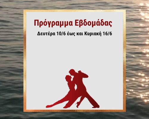 Ο Ιούλιος συνεχίζεται με πάθος και ρυθμό! Πρόγραμμα από Δευτέρα 15/7 έως και Κυριακή 21/7 Πέμπτη 18/7 – Practica – 22:00-00:00. Ελάτε να εξασκηθούμε, να διασκεδάσουμε και να βελτιωθούμε σε ένα χαλαρό και φιλικό περιβάλλον! Σάββατο 20/7 – Milonga “El Cabeceo” – Μια νύχτα γεμάτη ρομαντισμό ακριβώς στην μέση του καλοκαιριού! 22:00-02:00 DJ της βραδιάς: Ο μοναδικός... >>