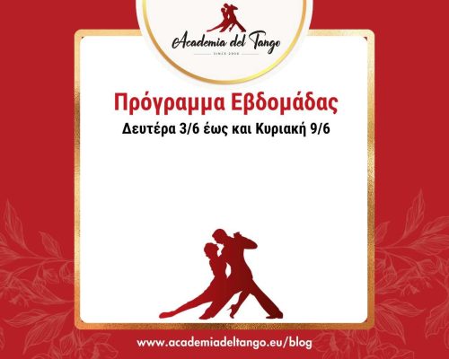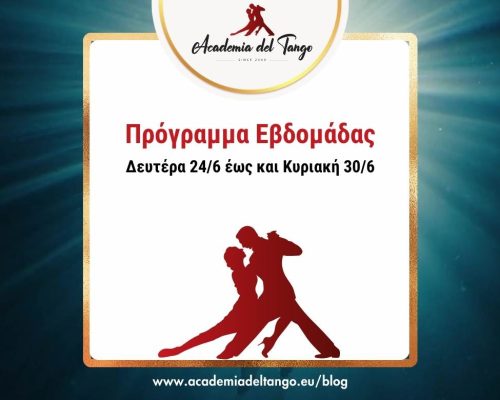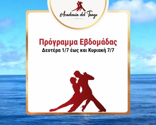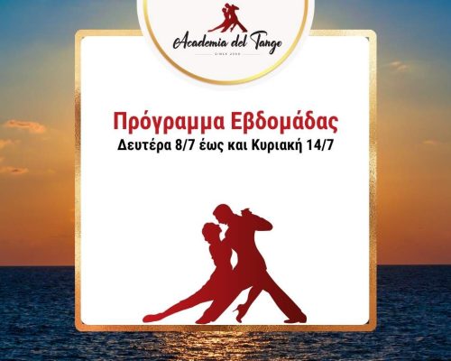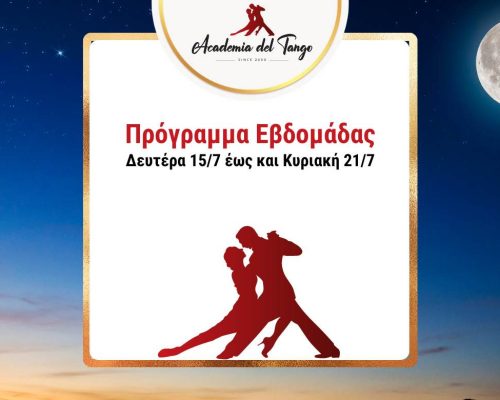 🌠Πρόγραμμα από Δευτέρα 8/7 έως και Κυριακή 14/7🌠Και αυτή την εβδομάδα δίνουμε δροσερό ραντεβού στο παρκέ μας! ❄️✨🍹🌠 Πέμπτη 11/7 – Practica – 22:00-00:00. Ελάτε να δουλέψουμε την τεχνική μας, να πειραματιστούμε με νέες φιγούρες και να βελτιώσουμε το αγκάλιασμά μας σε ένα χαλαρό περιβάλλον!🌠 Σάββατο 13/7 – Milonga “El Cabeceo” – 22:00-02:00!Ο DJ Αλέξης Παπαστεφανάτος υπόσχεται να μας κρατήσει... >>