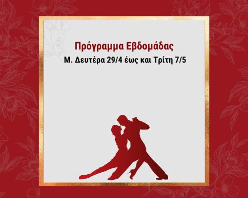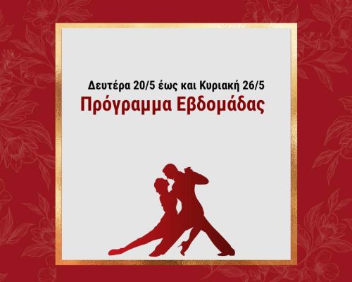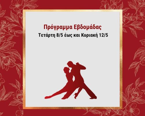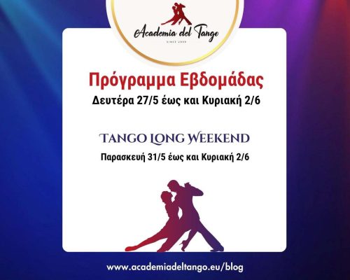 Ό,τι και να πούμε για αυτήν την εβδομάδα, είναι λίγο Ετοιμαστείτε για την απόλυτη χορευτική εκδήλωση της χρονιάς! Γιατί έτσι πρέπει να ξεκινάει ο Ιούνιος!! ✦Τρίτη 28/5 – Tango Vals – 21:30-22:30. Αφεθείτε στους ρυθμούς του με τους Lucas Gauto & Ναΐμα Γερασοπούλου! ✦ Πέμπτη 30/5 – Practica – 22:00-00:00. Εδώ θα εξασκηθούμε, θα διασκεδάσουμε και θα βελτιωθούμε σε ένα... >>