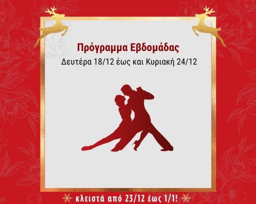 🎀Πρόγραμμα Εβδομάδας: Δευτέρα 18/12 έως και Κυριακή 24/12🎀 Βάλαμε τα γιορτινά μας και συνεχίζουμε, μια ανάσα πριν τα Χριστούγεννα να απολαμβάνουμε τον πιο υπέροχο χορό του κόσμου! 👠💝🎄 ✴️Τρίτη 19/12 – 𝗧𝗔𝗡𝗚𝗢 𝗩𝗔𝗟𝗦 21:30-22:30 Στροβιλιστείτε στους εναλλασσόμενους ρυθμούς του Tango Vals μαζί με τους Lucas Gauto και Naima Gerasopoulou! ✴️Πέμπτη 21/12 – 𝗣𝗥𝗔𝗖𝗧𝗜𝗖𝗔 22:00-00:00 Απολαμβάνουμε την εξάσκηση παίζοντας, διασκεδάζοντας και... >>