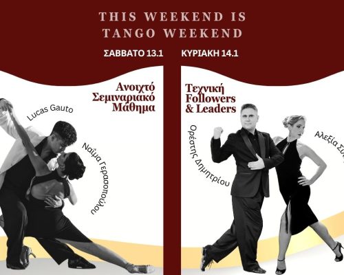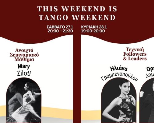 🌟 This weekend is Tango Weekend! 🌟 🌹Σάββατο 27.1 | 20:30 – 21:30 | Ανοιχτό Σεμιναριακό Μάθημα. Δυναμώστε τον χορό σας με ‘Pilates & Tango’ από την υπέροχη Μary Ziloti!  🌀Κυριακή 28/1:  19:00-20:00 | Τεχνική Followers & Leaders. Τεχνική Followers με την Ηλιάνα Γραμμενοπούλου ‘Voleos Atras’ και τεχνική Leaders με τον Ορέστη Δημητρίου ‘Συνδυασμός στοιχείων στο giro’. Ετοιμαστείτε για ένα Σαββατοκύριακο γεμάτο... >>