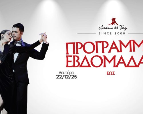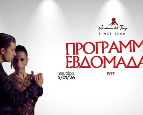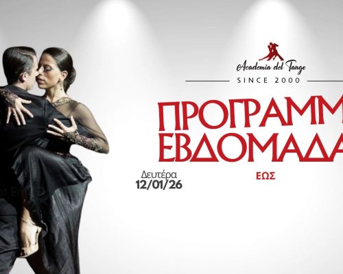 📅 Εβδομάδα 26/1 – 1/2 |📍 Academia del Tango Μια εβδομάδα με έμφαση στην τεχνική, την εξάσκηση και μια Milonga που κλείνει δυνατά τον μήνα. 🟠 Δευτέρα 26/1 | 21:00–22:00Ανοιχτό μάθημα Milonga με τη Μαριάννα Κουτάντου & τον Βαγγέλη ΧατζόπουλοΡυθμός, σύνδεση και συνεργασία στην πιο ζωντανή πλευρά του tango.Τιμή: Μέλη 7€ | Μη μέλη 12€ | Έκπτωση ζευγαριού –2€/άτομο 🟦... >>