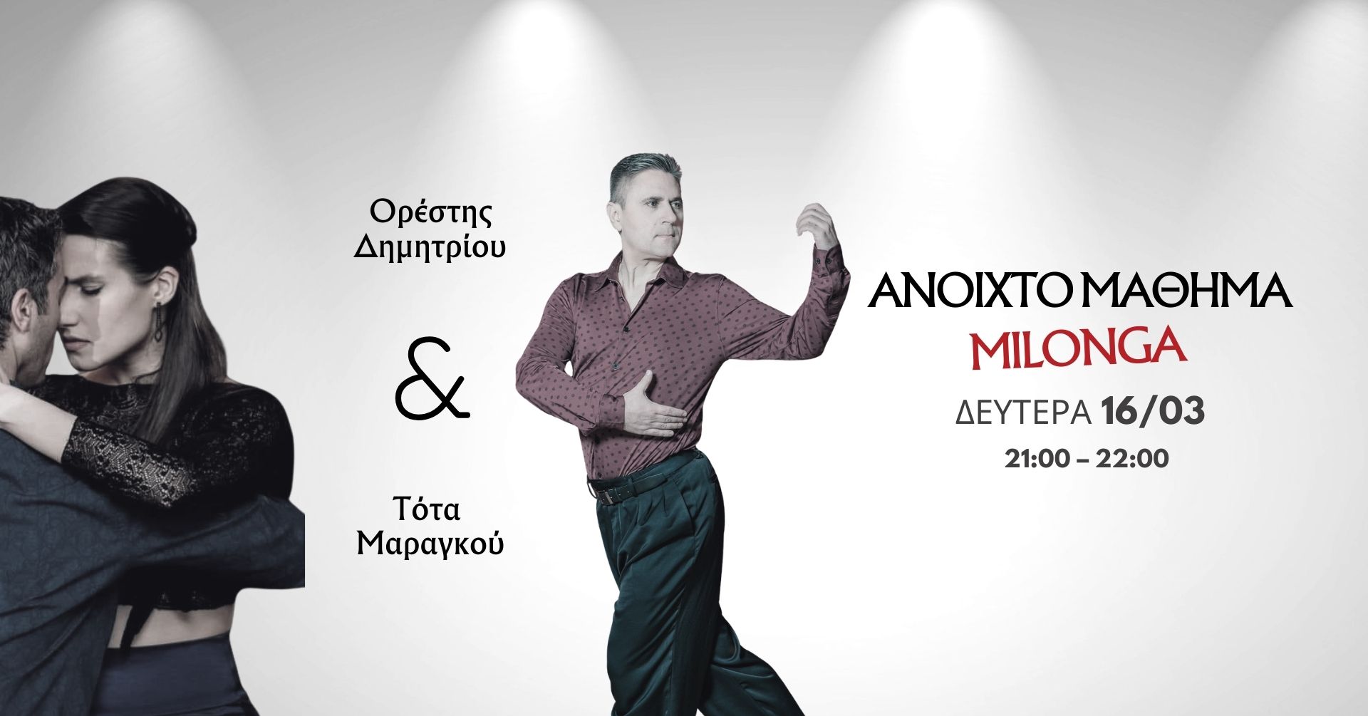 🟠 Δευτέρα 16/3 | 21:00–22:00 Ανοιχτό μάθημα Milonga με Ορέστη Δημητρίου & Τότα Μαραγκού Ρυθμός, συνεργασία και παιχνίδι στην πιο ζωντανή πλευρά του tango. Τιμή: Μέλη 7€ | Μη μέλη 12€ | Έκπτωση ζευγαριού –2€/άτομο