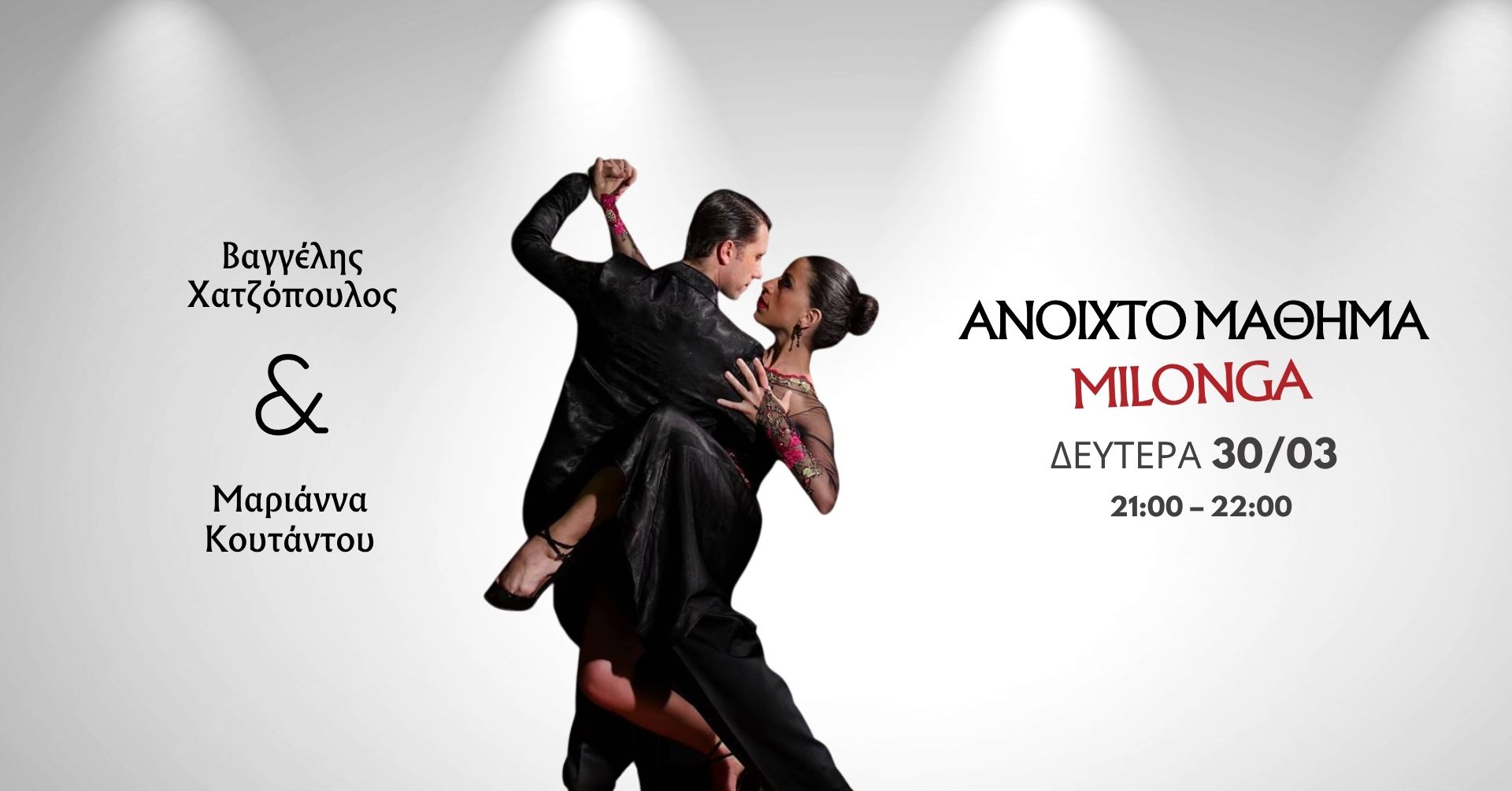 🟠 Δευτέρα 30/3 | 21:00–22:00 Ανοιχτό μάθημα Milonga με Βαγγέλη Χατζόπουλο & Μαριάννα Κουτάντου Ρυθμός, συνεργασία και επικοινωνία στην πιο ζωντανή πλευρά του tango. Τιμή: Μέλη 7€ | Μη μέλη 12€ | Έκπτωση ζευγαριού –2€/άτομο