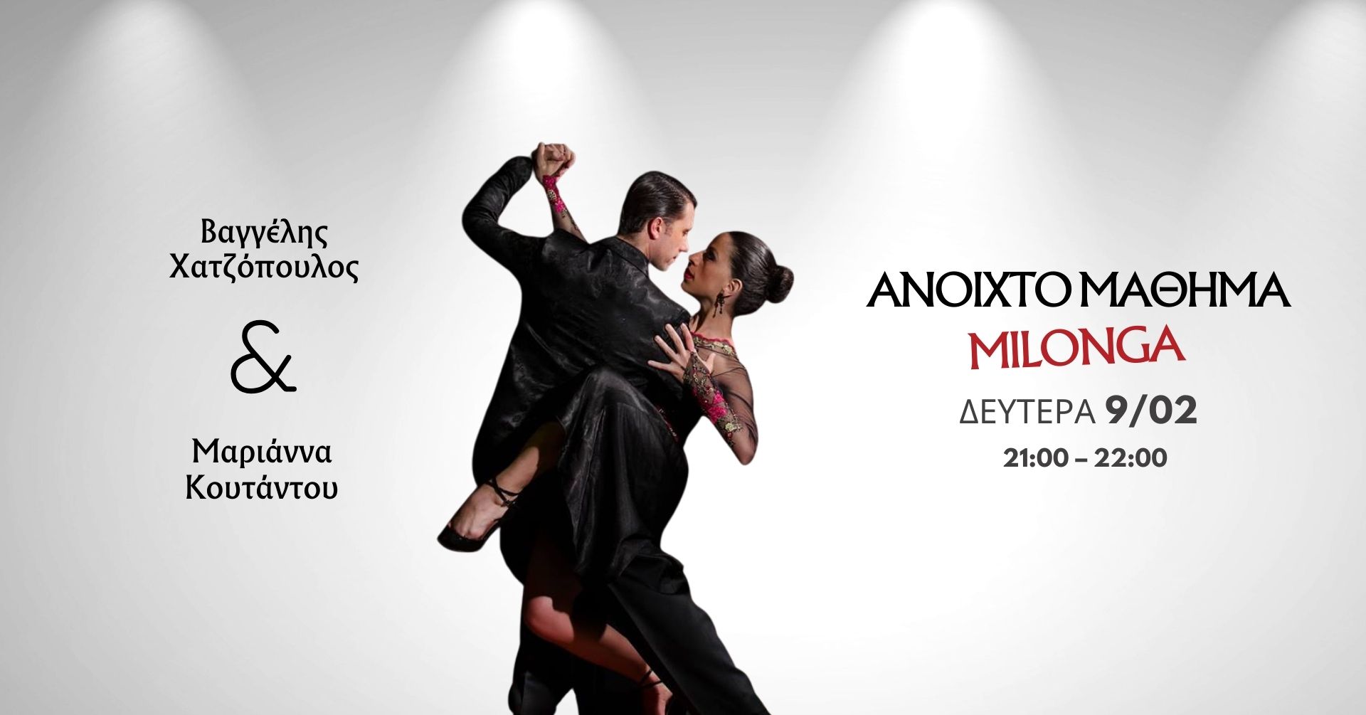 🟠 Δευτέρα 9/2 | 21:00–22:00 Ανοιχτόμάθημα Milonga μετηΜαριάνναΚουτάντου & τονΒαγγέληΧατζόπουλο Ρυθμός, παιχνίδι και επικοινωνία στην πιο ζωντανή πλευρά του tango. Τιμή: Μέλη 7€ | Μη μέλη 12€ | Έκπτωση ζευγαριού –2€/άτομο