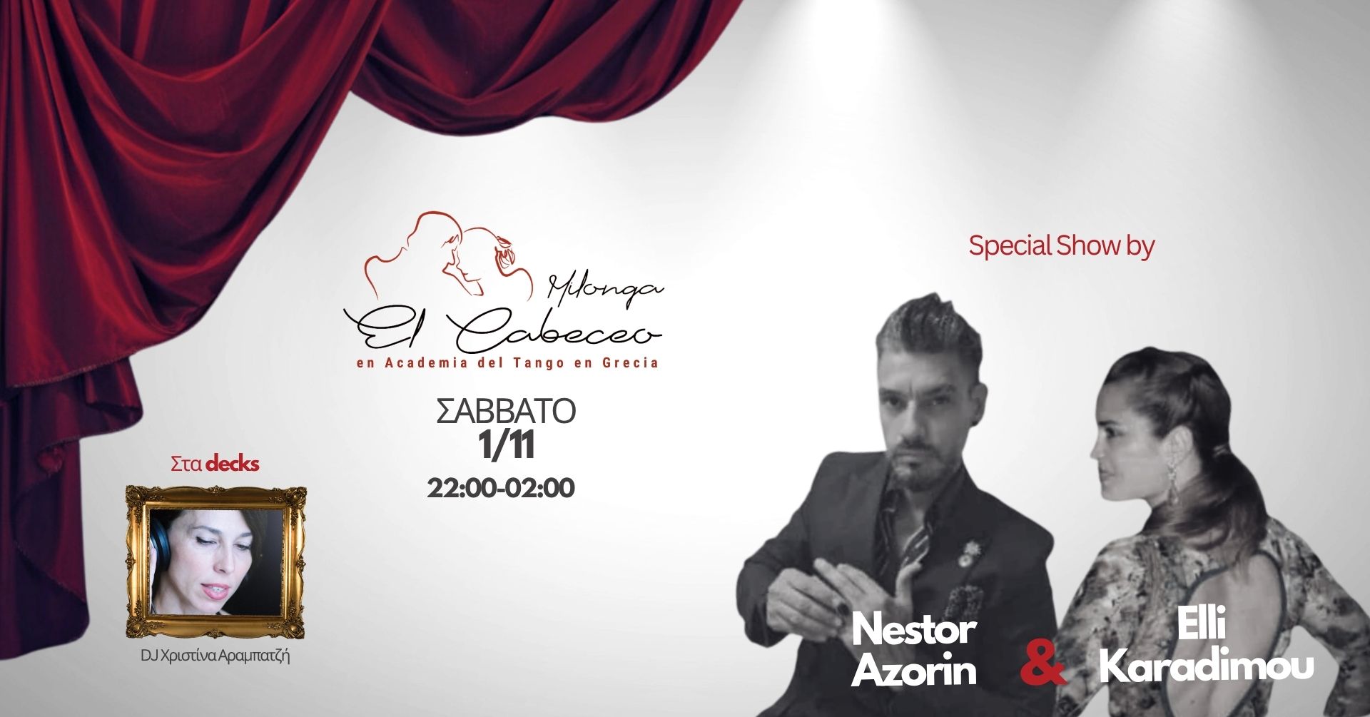 💃 Σάββατο 1/11 | 22:00–02:00 Milonga “El Cabeceo” με show από τους Néstor Azorín & Έλλη Καραδήμου και DJ τη Χριστίνα Αραμπατζή.🎧Ένα show με ατμόσφαιρα, τεχνική και πάθος που θα μεταμορφώσει τη βραδιά σε εμπειρία.🎟 Είσοδος:15€ με ποτό Κεντρική ιδέα: Ο παραδοσιακός τρόπος επιλογής παρτενέρ για χορό, το CABECEO!