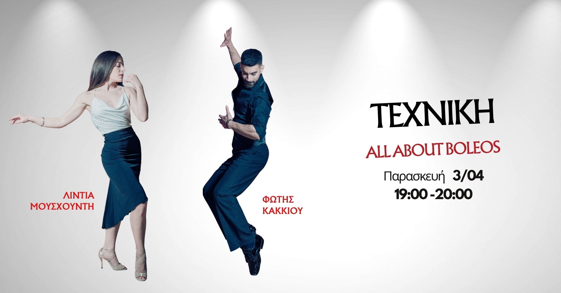 🟡 Παρασκευή 3/4 | 19:00–20:00 Τεχνική Ντάμας & Καβαλιέρου με Φώτη Κακκιού & Λίντια Μουσχουντή Θέμα:All about boleos Έλεγχος, άξονας και δυναμική σε μια από τις πιο χαρακτηριστικές κινήσεις του tango. Τιμή: Μέλη 5€ | Μη μέλη 10€