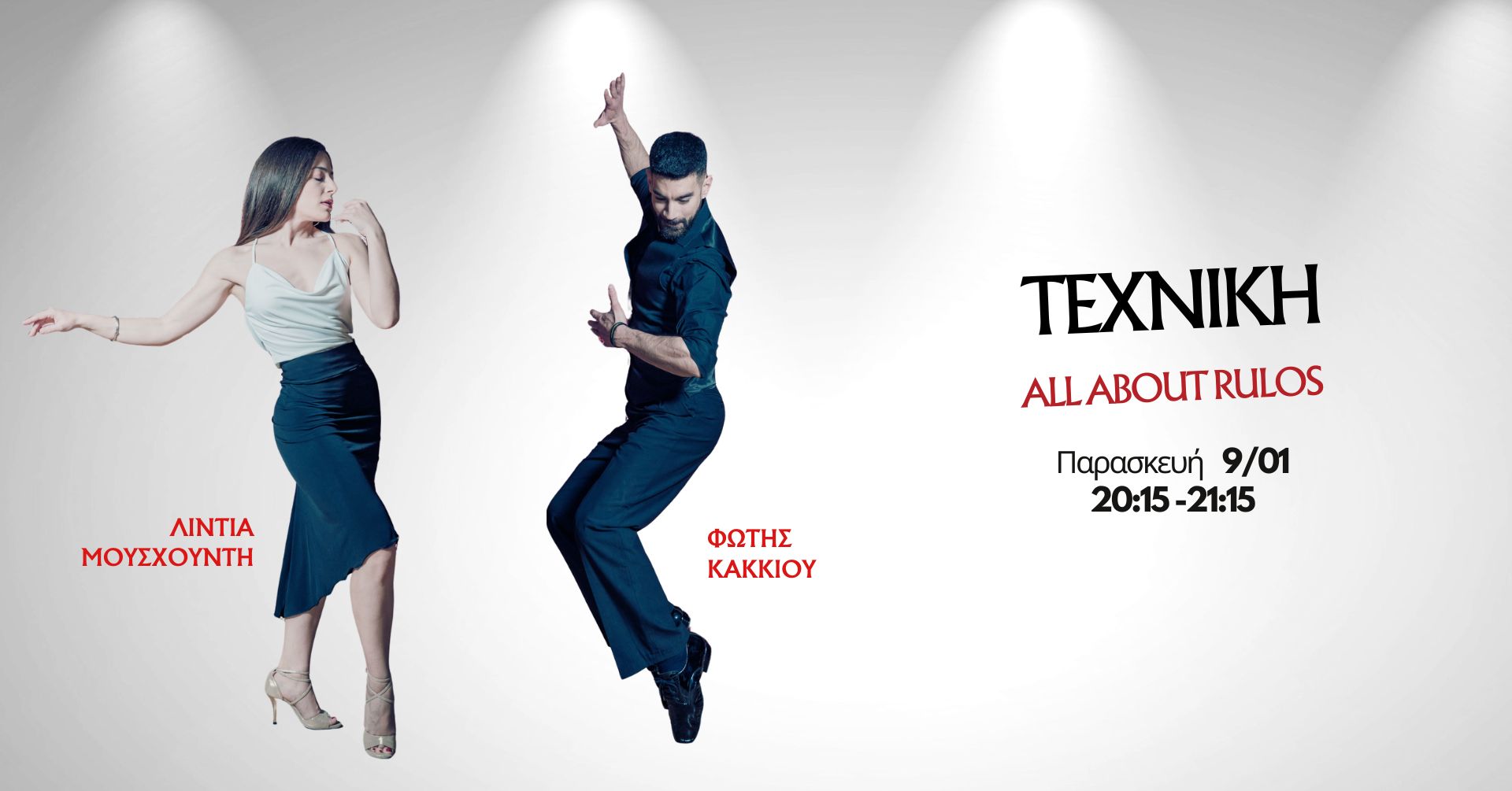 🟡 Παρασκευή 9/1 | 20:15–21:15 Τεχνική Ντάμας & Καβαλιέρου με Φώτη Κακκιού & Λίντια Μουσχουντή Θέμα:All about rulos Έλεγχος, ακρίβεια και καθαρή κίνηση στις περιστροφές. Τιμή: Μέλη 5€ | Μη μέλη 10€