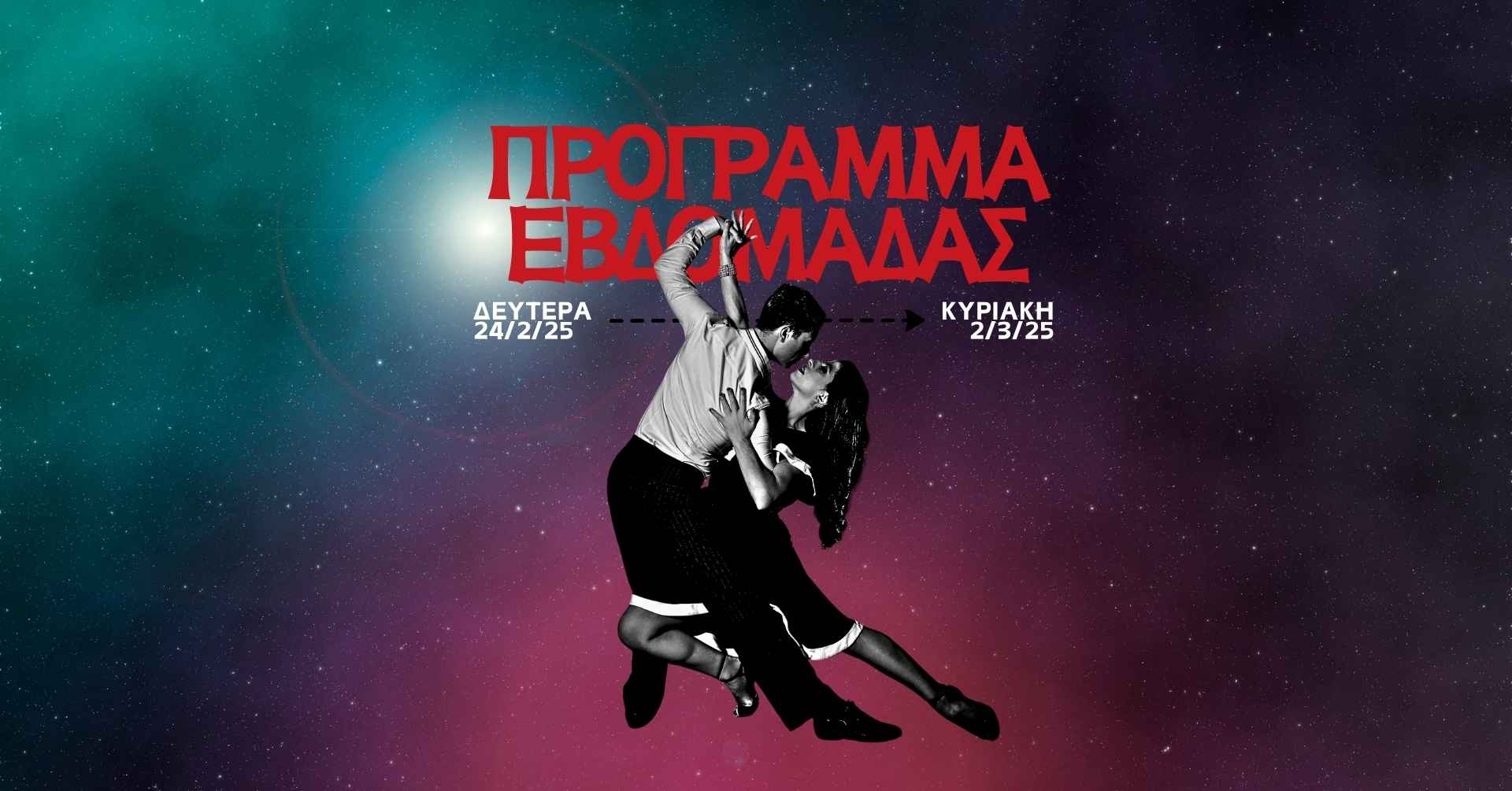 Σάββατο 1/3, 22:00-02:00 – Καρναβαλική Milonga “El Cabeceo” Η Γεωργία Προίσκου μας ταξιδεύει στον παλμό του tango με αποκριάτικη διάθεση – φέρτε το κέφι σας και αφήστε τη μουσική να σας παρασύρει! 😎 Happy Hour: 22:00-23:00: Είσοδος 5€ Μετά τις 23:00: Γενική είσοδος: 8€ με ποτό (για special ποτά +3€/+4€) Φοιτητές/Άνεργοι/Μαθητές: 7€ με ποτό
