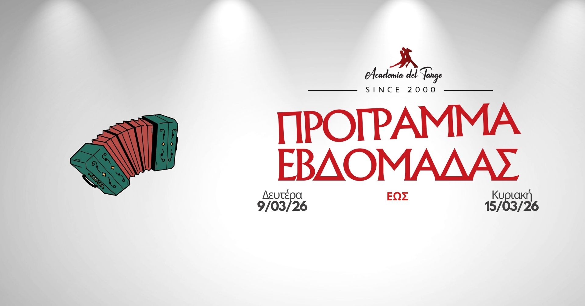 🟠 Δευτέρα 9/3 | 21:00–22:00 Ανοιχτό μάθημα Milonga με Φώτη Κακκιού & Λίντια Μουσχουντή Ρυθμός, επικοινωνία και παιχνίδι στην πιο ζωντανή εκδοχή του tango. Τιμή: Μέλη 7€ | Μη μέλη 12€ | Έκπτωση ζευγαριού –2€/άτομο