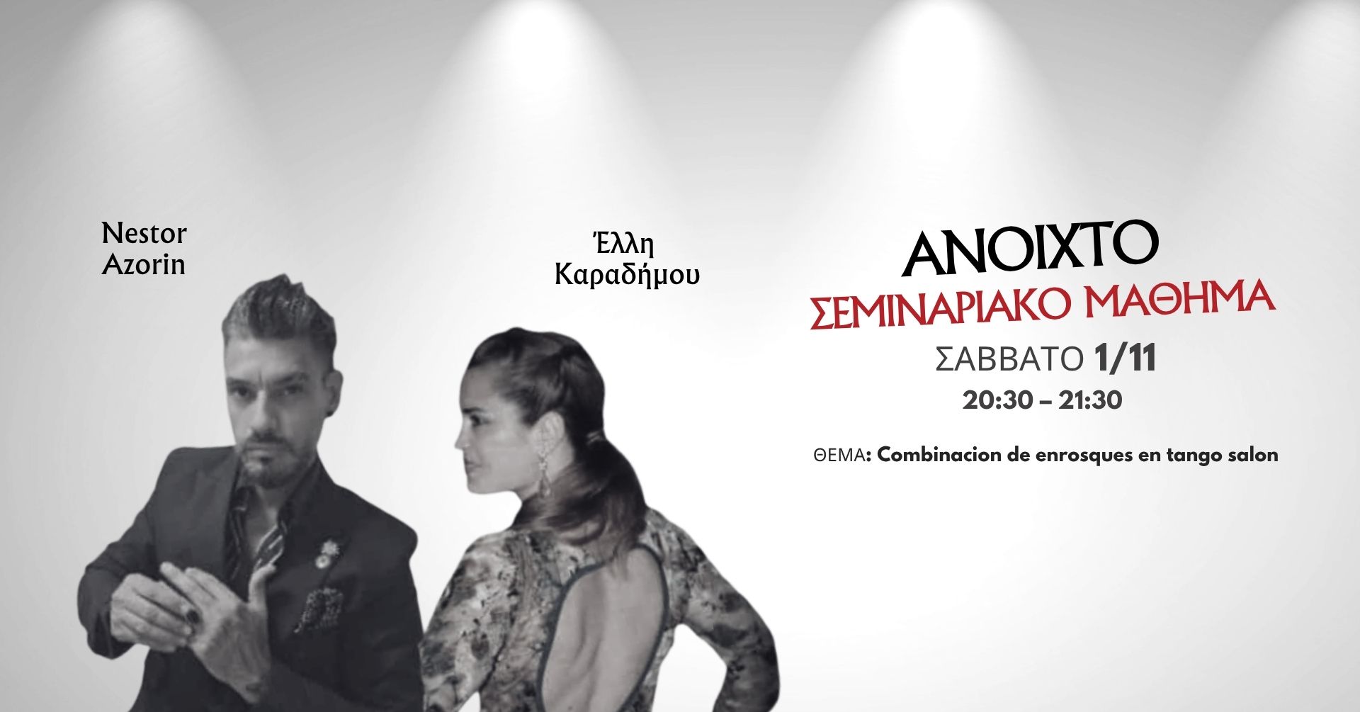 🟤 Σάββατο 1/11 | 20:30–21:30 Σεμιναριακό Μάθημα με Néstor Azorín & Έλλη Καραδήμου Θέμα:Combinacion de enrosques en tango salón Μια εξερεύνηση πάνω στους συνδυασμούς των enrosques, για να εμπλουτίσεις την ποιότητα και τη ροή του χορού σου. Τιμή: Μέλη 7€ | Μη μέλη 12€ | Έκπτωση ζευγαριού –2€/άτομο