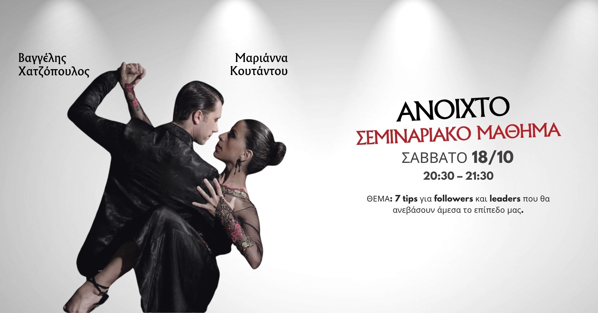 🟤 Σάββατο 18/10 | 20:30–21:30 Σεμιναριακό μάθημα με Βαγγέλη Χατζόπουλο & Μαριάννα Κουτάντου Θέμα:7 tips για followers και leaders που θα ανεβάσουν άμεσα το επίπεδό μας Χρήσιμες πρακτικές, παρατηρήσεις και λεπτομέρειες που αλλάζουν τον τρόπο που χορεύουμε. Τιμή: Μέλη 7€ | Μη μέλη 12€ | Έκπτωση ζευγαριού –2€/άτομο