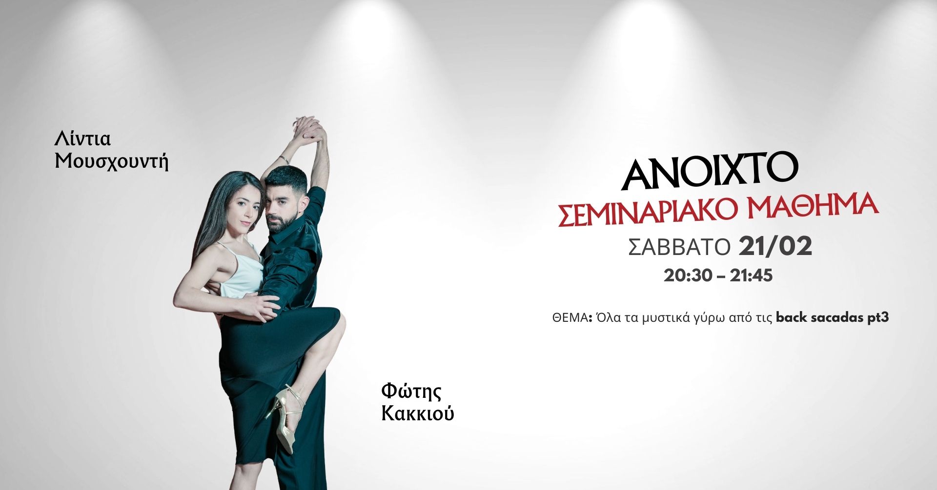 🟤 Σάββατο 21/2 | 20:30–21:45 Σεμιναριακό μάθημα με Φώτη Κακκιού & Λίντια Μουσχουντή Θέμα:Όλα τα μυστικά γύρω από τις back sacadas — Part 3 Βάθος, χρονισμός και καθαρή εφαρμογή των back sacadas στην pista. Τιμή: Μέλη 7€ | Μη μέλη 12€ | Έκπτωση ζευγαριού –2€/άτομο