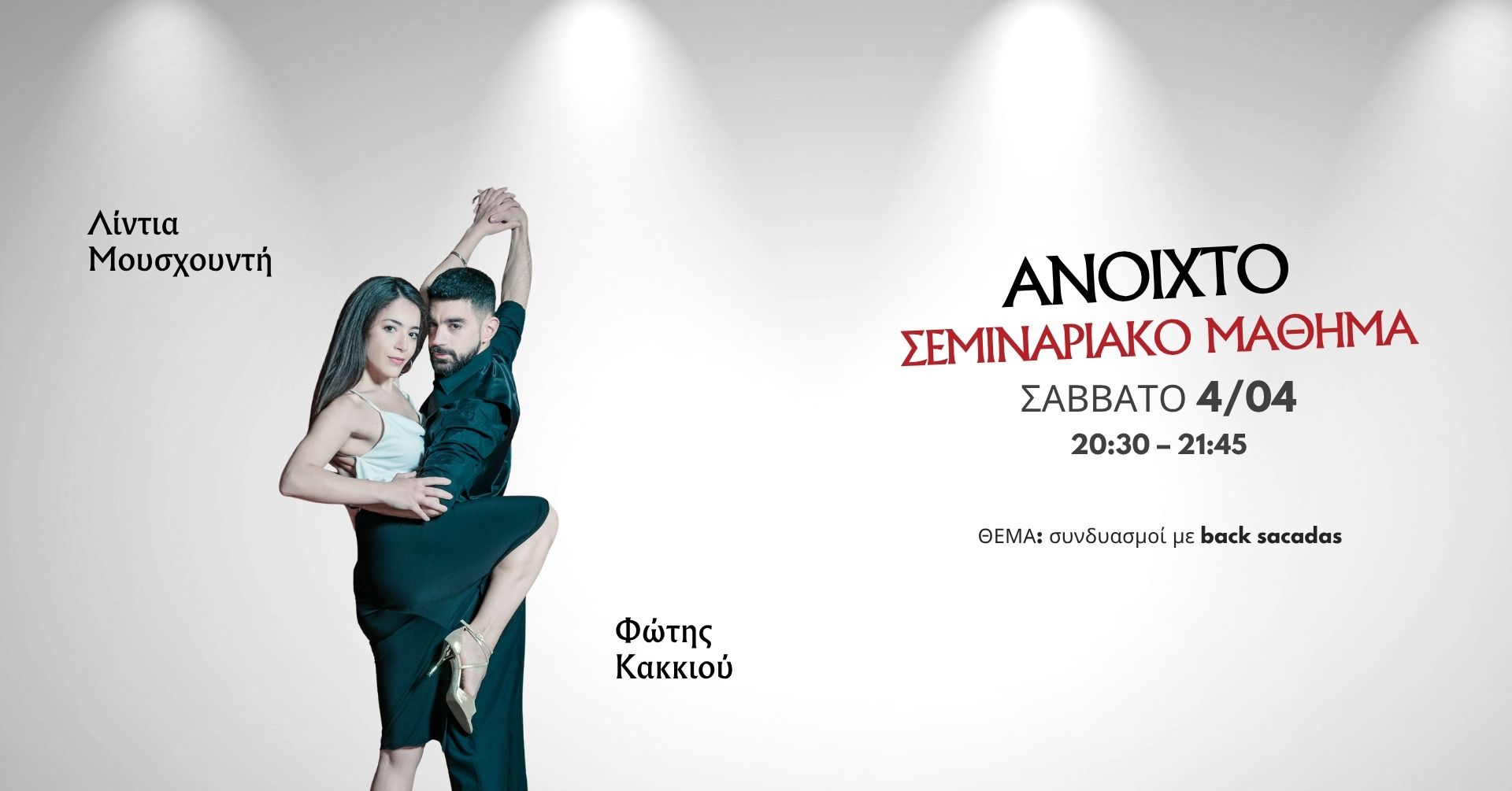 🟤 Σάββατο 28/3 | 20:30–21:45 Σεμιναριακό μάθημα με Φώτη Κακκιού & Λίντια Μουσχουντή Θέμα:συνδυασμοί με back sacadas Τιμή: Μέλη 7€ | Μη μέλη 12€ | Έκπτωση ζευγαριού –2€/άτομο