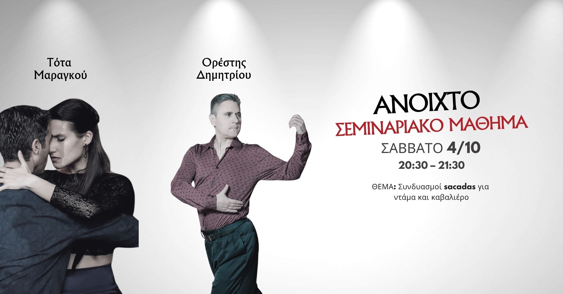 🟠 Σάββατο 4/10 | 20:30–21:30 Πρώτο σεμιναριακό μάθημα με Ορέστη & Τότα Θέμα:Συνδυασμοί με Sacadas ντάμας και καβαλιέρου για μικρούς χώρους που χορεύονται εξίσου σε Tango και Vals. Τιμή: Μέλη 7€ | Μη μέλη 12€ | Έκπτωση ζευγαριού –2€